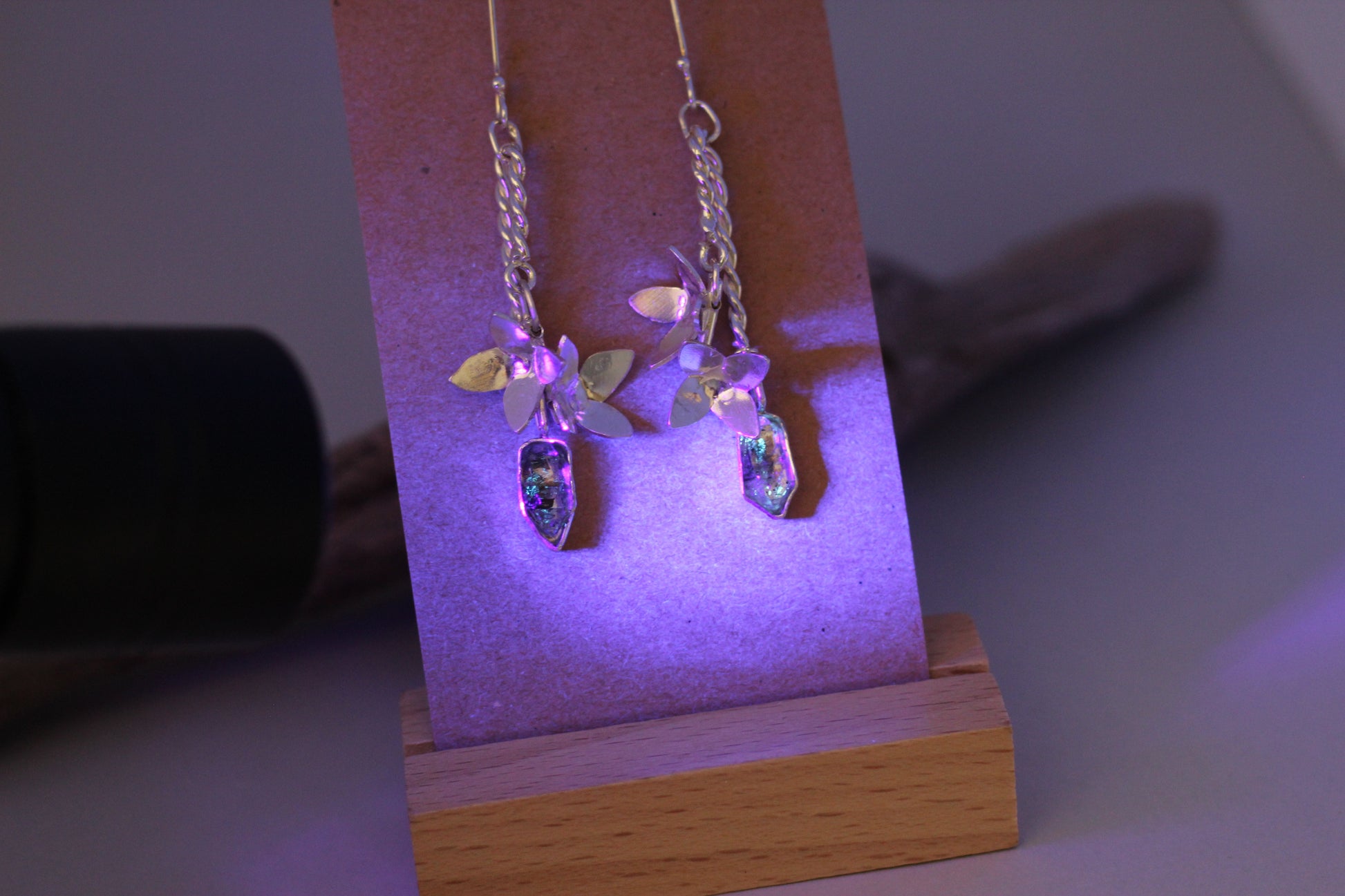 Länge: ca. 4cm, Blumen Elemente ca. 2x1cm, Quarz ca, 1,0x0,5cm, gedrehter Silberdraht-Element ca. 3mm dick. - Highlight: UV-reaktiv (leuchtet unter Schwarzlicht)
