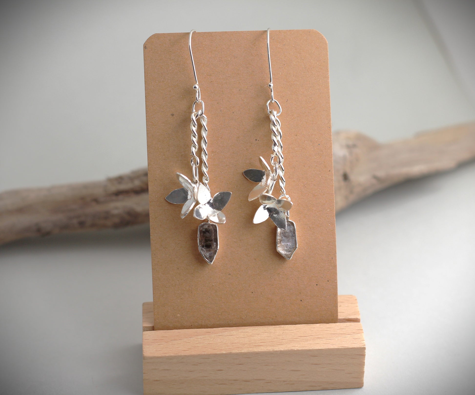 Erleben Sie die faszinierende Verbindung aus Natur und geologischer Seltenheit. Diese handgefertigten Silber-Ohrhänger bestechen durch einfache Blüten-Elemente und einem klaren Bergkristall mit echten Petroleumeinschlüssen.